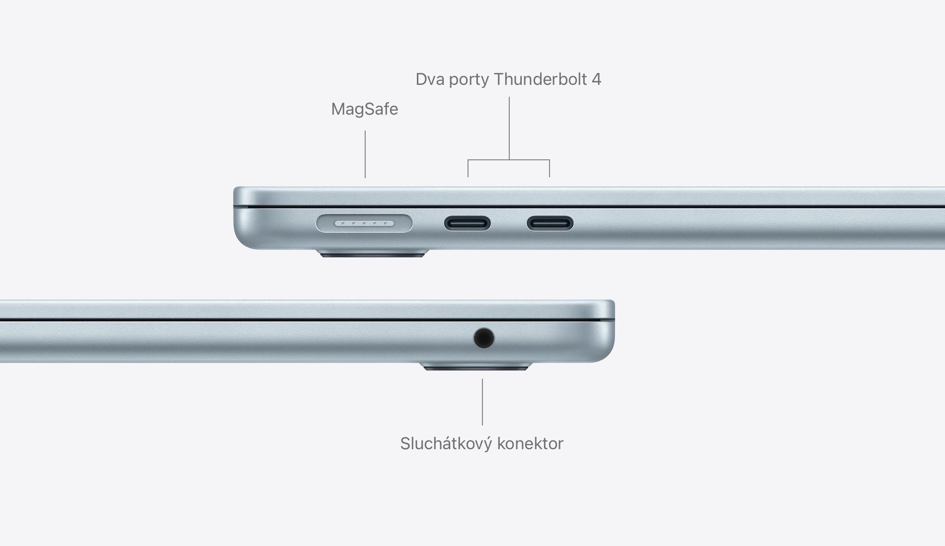 MagSafe nabíjecí kabel se připojuje a drží pomocí magnetů. A když o něj omylem zakopneš, uvolní se, takže si počítač neshodíš na zem. Dva porty Thunderbolt 4 přijdou vhod na připojení vysokorychlostních doplňků a napájení Macu. Sluchátkový konektor podporuje vysokoimpedanční sluchátka. A čip Apple N1 pro bezdrátové sítě ti zpřístupní Wi-Fi 7 a Bluetooth 6 pro rychlejší a spolehlivější připojení.