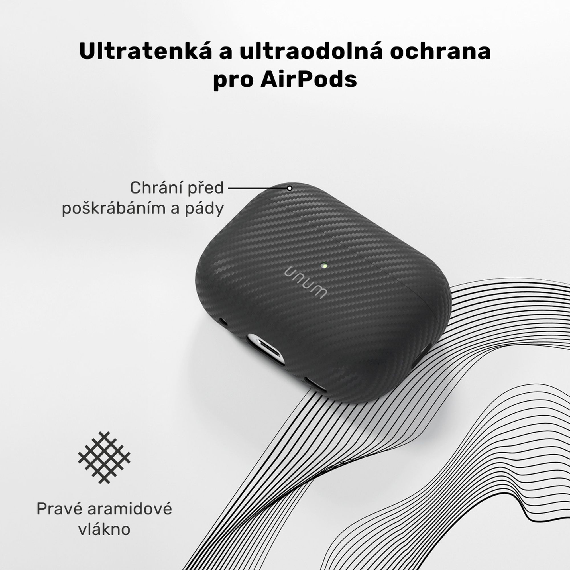 Epico UNUM Aramid Case kombinuje minimalistický vzhled s maximální ochranou. Kryt je vyroben z pravého aramidového vlákna, které je extrémně pevné, odolné proti poškrábání a zároveň velmi tenké. Díky přesnému provedení perfektně kopíruje tvar pouzdra AirPods Pro 3 a chrání ho před prachem, pády i každodenním opotřebením, aniž by zbytečně přidával na objemu.