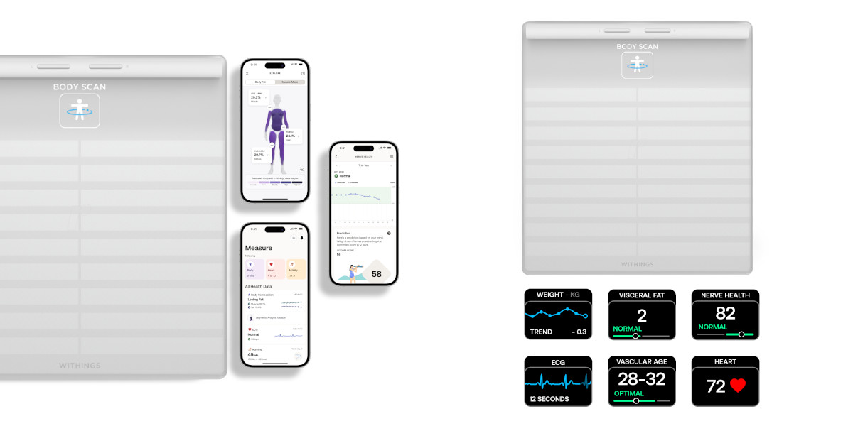 Body Scan je více než jen chytrá váha. Body Scan je první připojenou zdravotní stanicí. Překlenuje propast mezi přístupem k průlomovým metrikám a integrovanou podporou od trenérů a zdravotníků. Body Scan poskytuje přesnou hmotnost, segmentální složení těla a zdraví srdce pomocí 6svodového EKG a vaskulárního věku. Navíc exkluzivní technologie, která dokáže posoudit zdraví nervů.